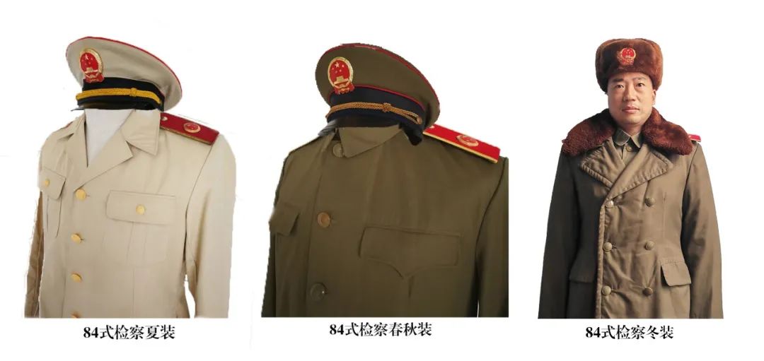 84式检察装:分为两种颜色,夏季服为米黄色,冬季服为豆绿色。采用了大檐帽、肩章等设计。