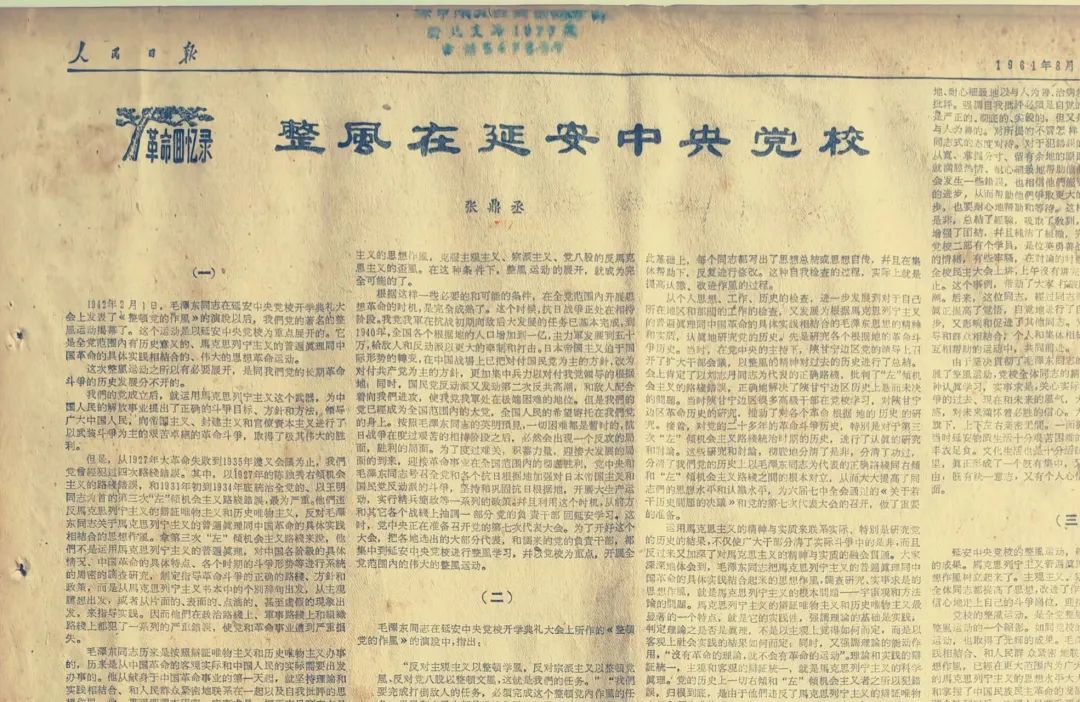 这是一张1961年8月17日的《人民日报》,掐指算来,已经过了一个甲子了。报纸上刊登的整版文章,标题是:《整风在延安中央党校》。文章的作者,是我们的检察前辈张鼎丞。