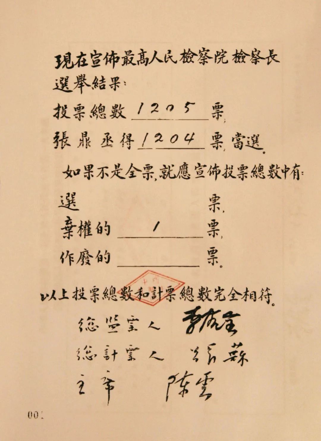 1954年9月27日,在第一届全国人民代表大会第一次会议上,张鼎丞当选为最高人民检察院检察长。在共和国的历史上,他是第二任检察长,也是第一位由人民代表选举出的检察长。他的当选和就任,结束了“人民检察署”的历史,开启了“人民检察院”的崭新历程。至今,中央档案还保存着他第一次当选的选举结果。